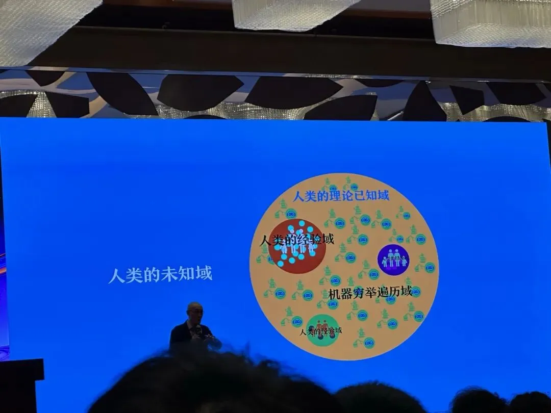 但有了 AI 之后,AI 可以帮你去穷举、遍历那些你之前根本接触不到的领域——这就是图中的"机器穷举遍历域"。而最外面那一大片蓝色,是"人类的未知域"——AI 也还没能覆盖的地方。