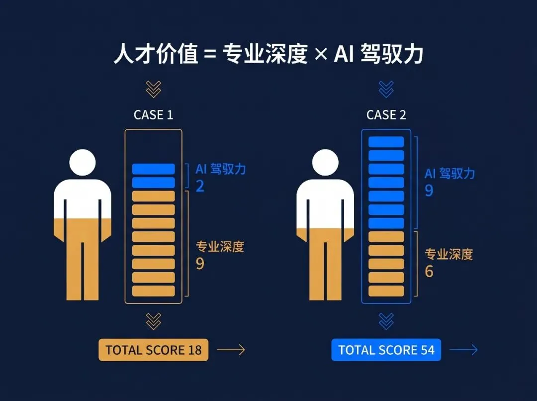 乘法意味着:任何一项接近零,总分就趋近于零。 一个专业能力 9 分但完全不会用 AI 的人,产出可能还不如一个专业 6 分但 AI 驾驭力 9 分的人。因为后者可以借助 AI 把自己的 6 分能力放大到远超前者。