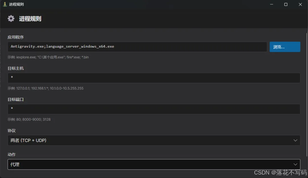 这里需要将Antigravity联网进程都添加进去,包括Antigravity.exe和language_server_windows_x64.exe,将“Protocol”设置为"Both(TCP+UDP)",然后保存设置。