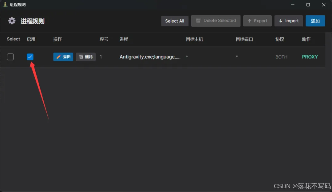 关于Antigravity无法连接网络问题。使用开源软件 ProxyBridge 将 Antigravity IDE 使用过程中的联网进程所发起的网络请求全部转发至我们的代理端口。