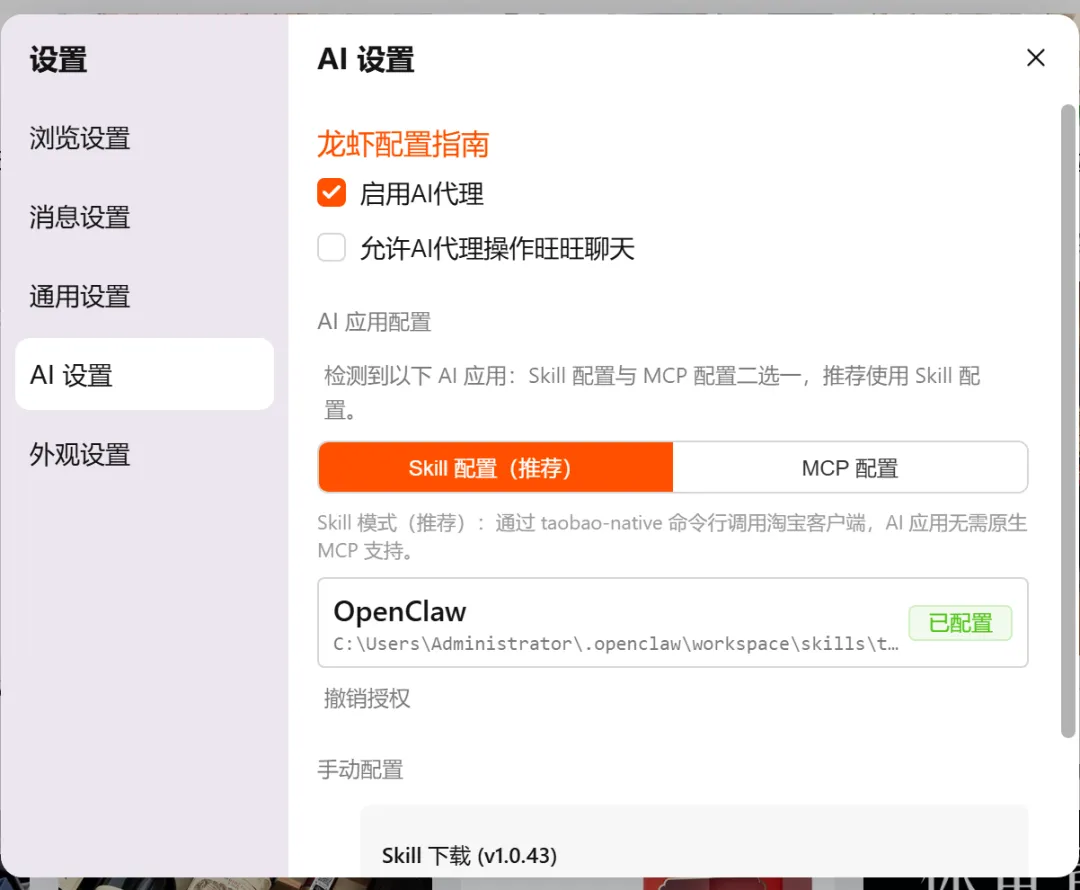 2、在淘宝配置中AI设置中启用AI代理,并下载SKILL