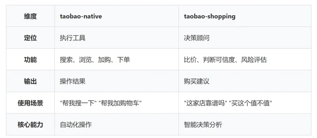 如果说taobao-native是"手",那taobao-shopping就是"脑"。一个负责执行,一个负责思考。