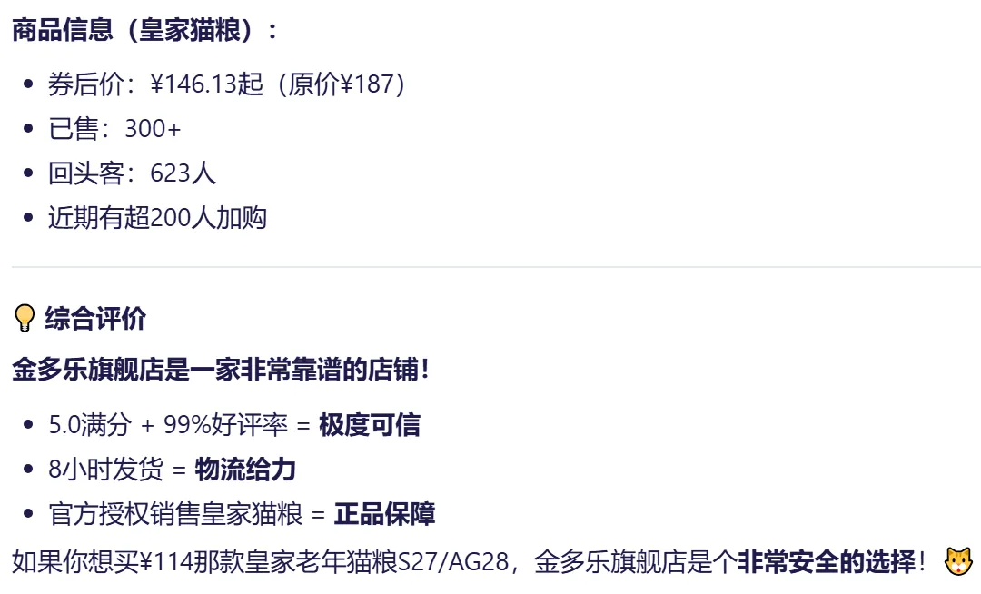 昨天我家主子(银渐层大侠)的猫粮见底了。作为一个合格的铲屎官,我打开淘宝准备买皇家猫粮。然后我突然想到:为什么不试试AI呢?