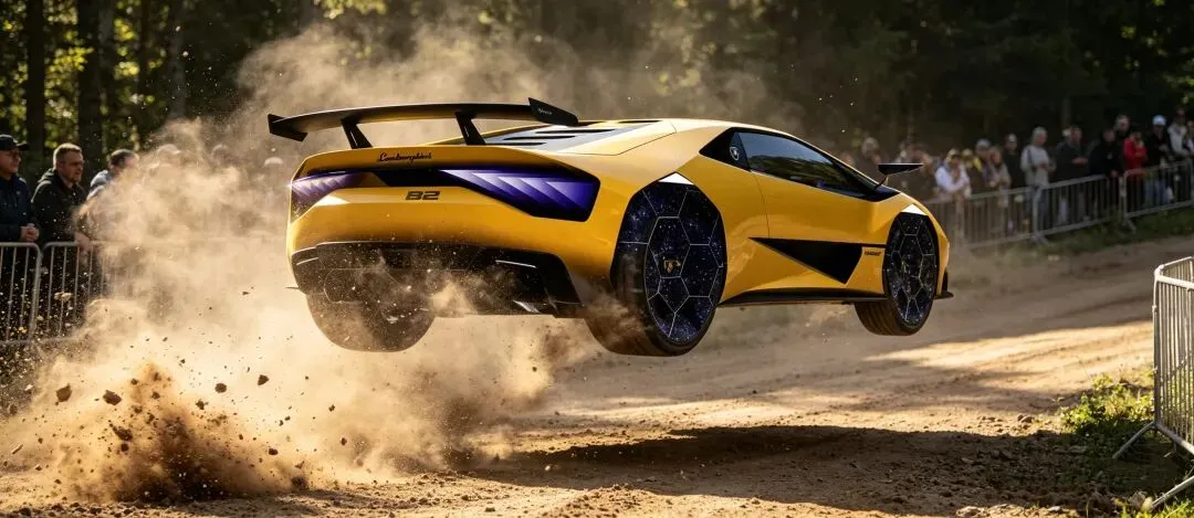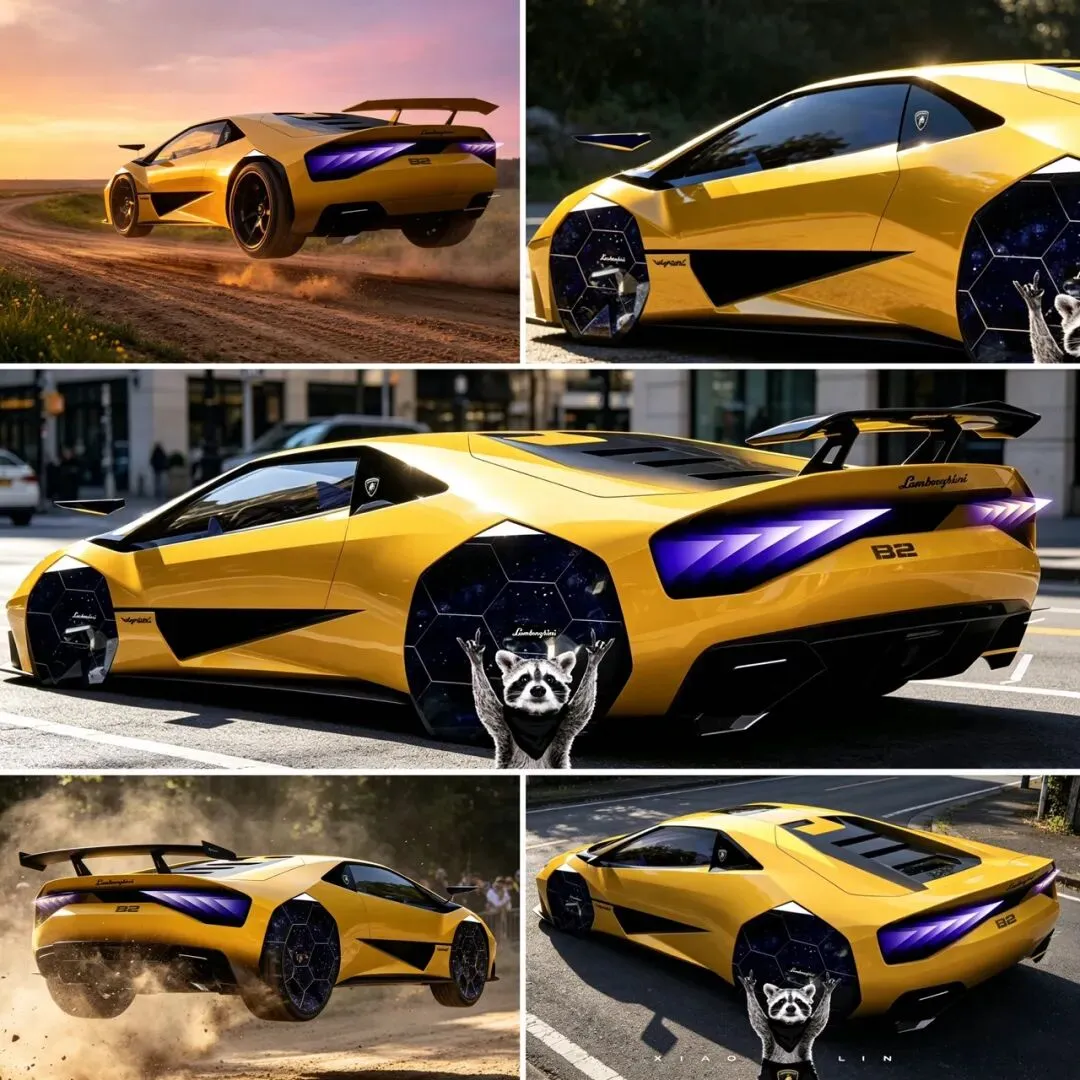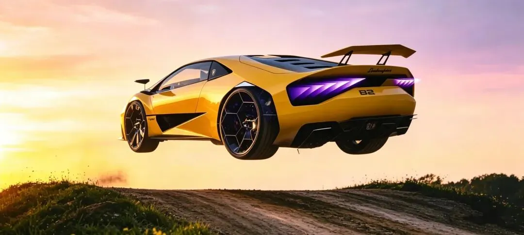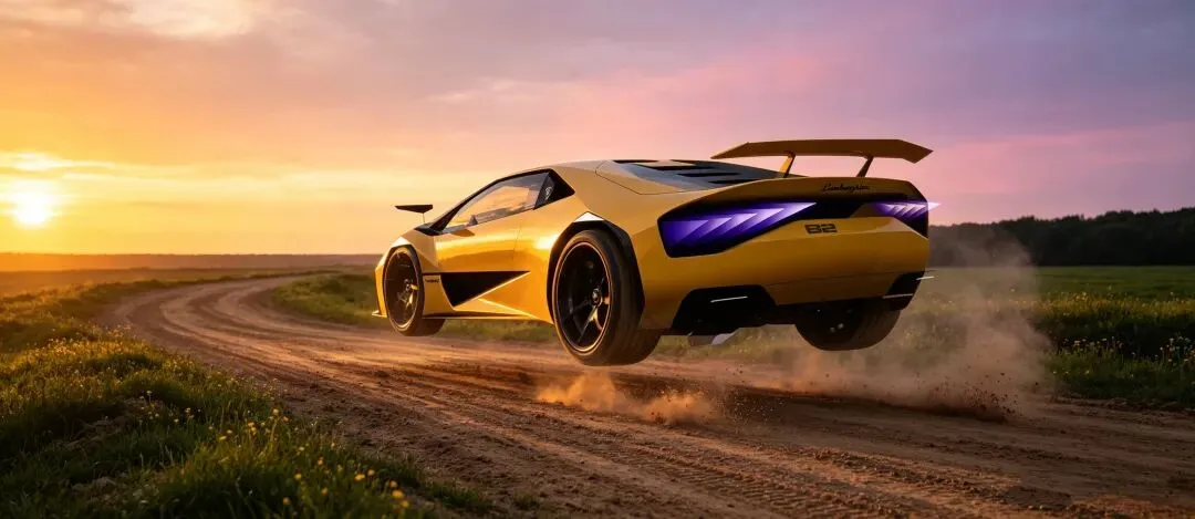 云海翻涌,远处山路上,一辆亮黄色的兰博基尼B2在黄昏中扬起金色尘土,轮毂间的星空仿佛真的开始旋转,吞噬着最后一线天光,又释放出紫色的、雷鸣般的尾焰。