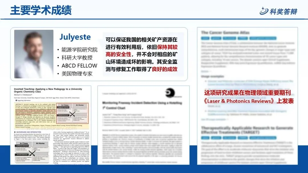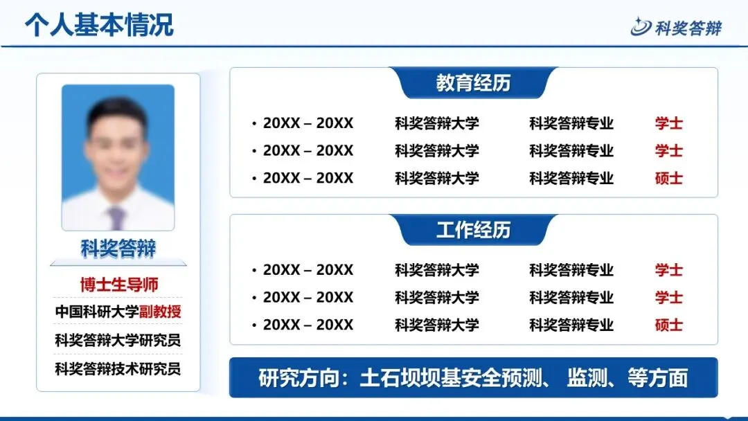 整体采用清爽的蓝白配色,风格严谨大气,完美契合科奖答辩的专业调性。从封面、目录到个人介绍、学术成果、研究内容等全流程页面都已预设,层级清晰、重点突出,能帮你高效呈现项目亮点,省去排版烦恼。