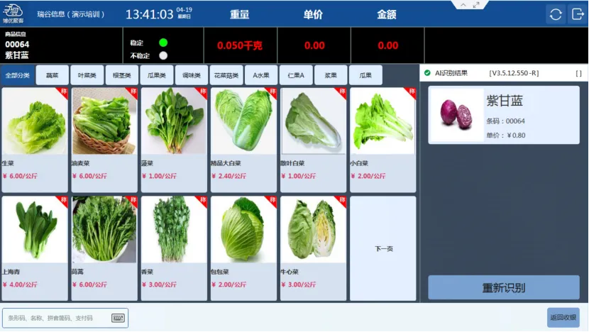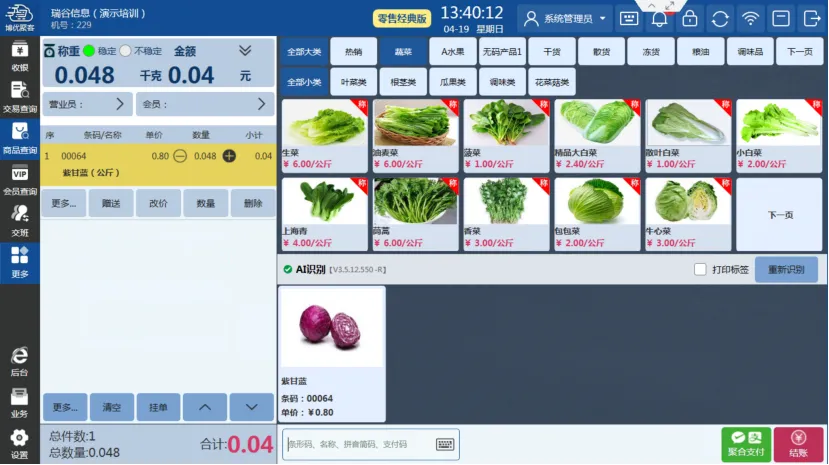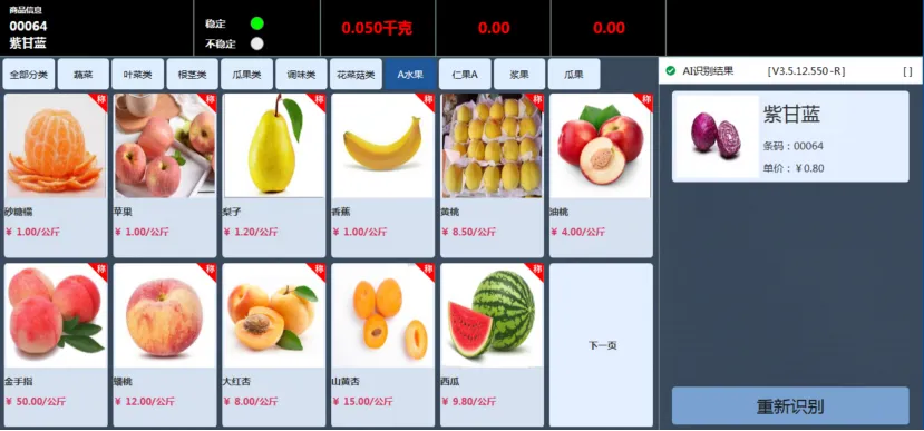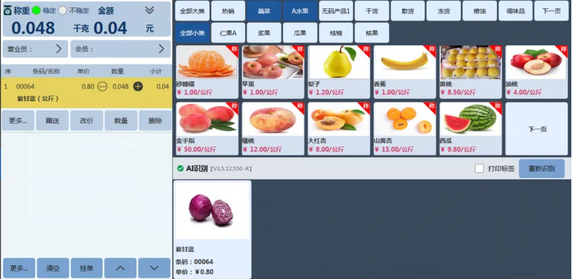 这款一体机的核心亮点,不仅是贴合生鲜、干货店经营场景的收银/标签一键切换设计,更搭载了高效AI识别功能,操作极简,无需复杂调试,哪怕是新员工,短时间熟悉后也能熟练操作。日常商品上架时需要打印预包装标签时,一键切换至标签模式,开启AI识别,无论是生鲜果蔬、鲜肉水产,还是干货炒货、散装杂粮,只需将商品放在秤盘上,AI摄像头可快速识别商品品类,配合高精度称重模块完成计量,自动匹配预设单价,同步打印规范标签,清晰标注品名、重量、价格、生产日期等关键信息,贴标即上架,既合规又高效,彻底告别手动写价、错标漏标的麻烦,识别准确率超99%,单次识别耗时低于0.1秒,大幅提升贴标效率。