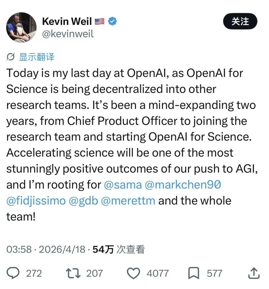 但当你看到 Kevin Weil 这样的核心高管只能发一条冷冰冰的告别帖,当你看到 Prism 团队那 10 个人就这样被" decentralized into other research teams",你会突然明白: