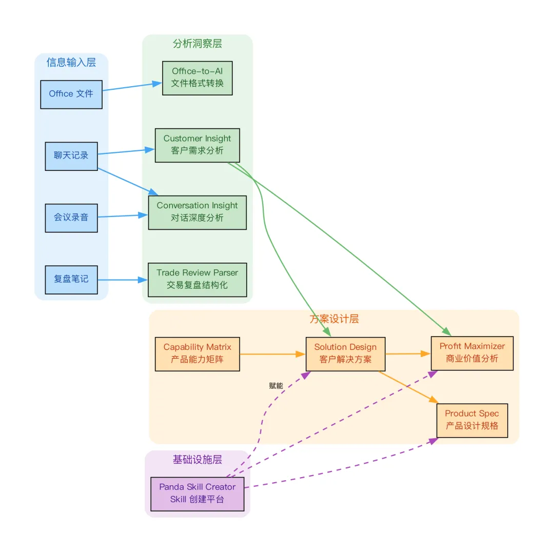 就像给一个通用助手,装上了不同专业的"技能包"。装上"客户分析"技能,它就是一个售前顾问;装上"方案设计"技能,它就是一个解决方案架构师。