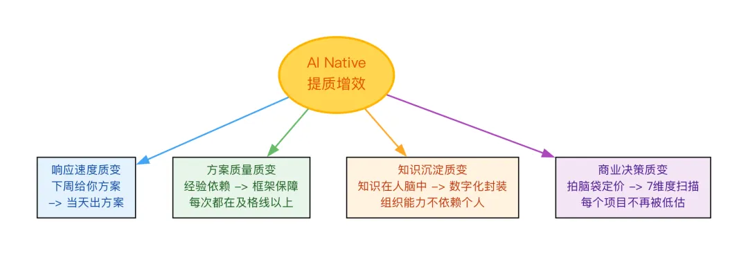质量质变。 方案质量不再依赖写方案的人。AI 遵循的是经过验证的最佳实践框架。每次输出都有保底。