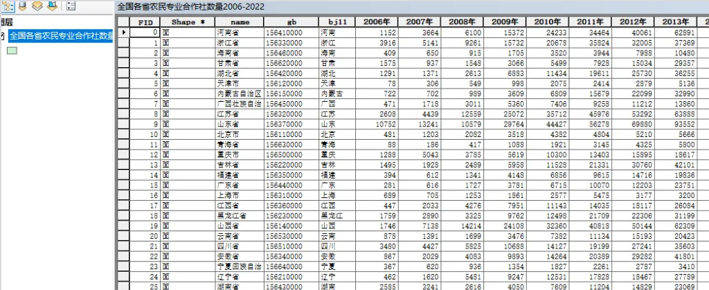 全国各省农民专业合作社数量(2006-2022),数据为shp/excel格式。请自行斟酌使用。