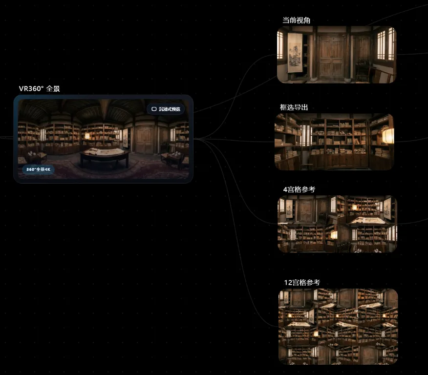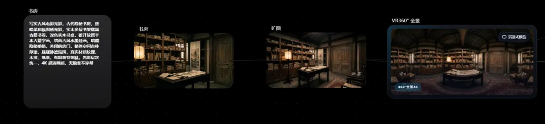 接着使用扩图功能将场景进行了下扩充(防止小图转360°全景变形),之后添加VR 360°全景节点,来生成书房的VR 360°全景场景图