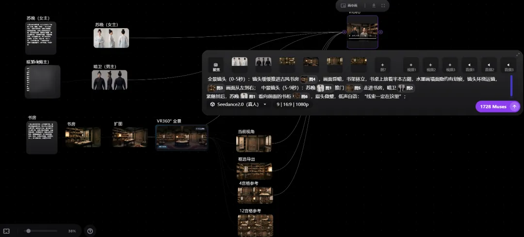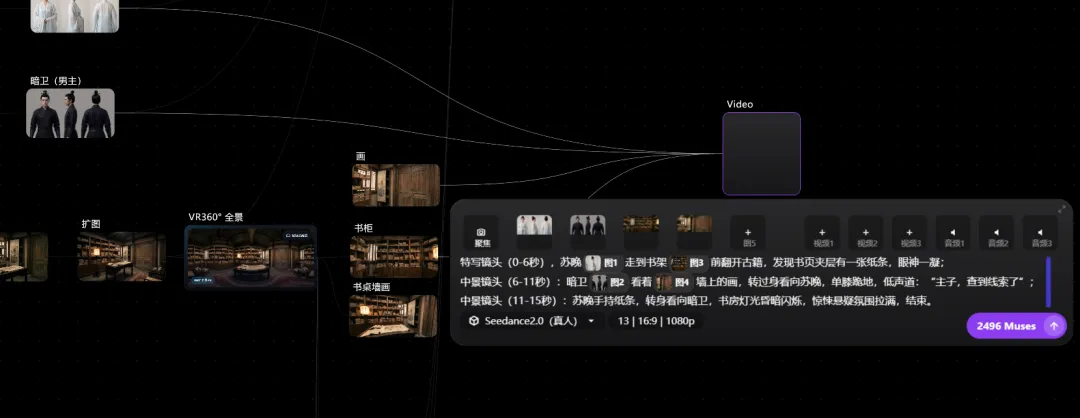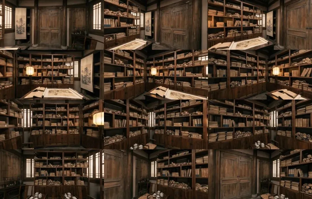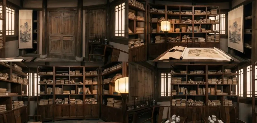 简单构思了个片段故事,将场景围绕在书房内展开,结合4宫格参考图通过提示词控制了下在书房内的环绕运镜来看看整个书房画面空间一致性效果。