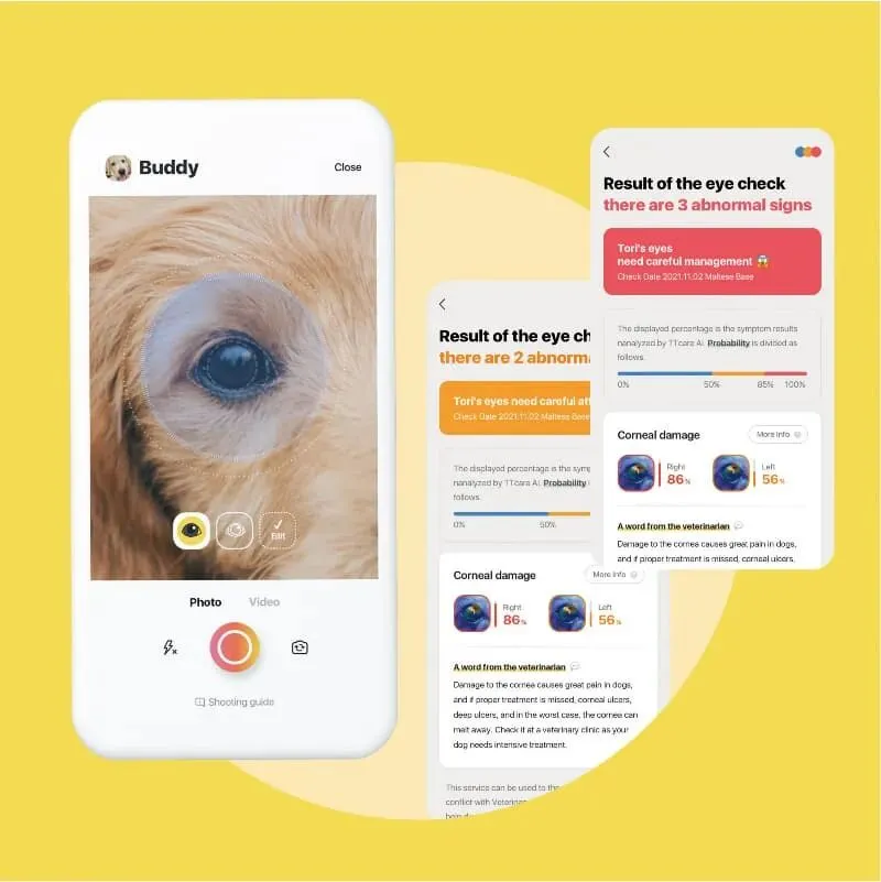 它的做法是让宠物主人用手机拍摄或录制宠物的眼睛、皮肤、牙齿和步态,再由系统分析是否存在健康异常。