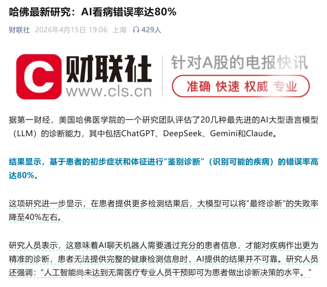 这个场景的需求很真实:我有十几年的体检报告、检查检验单散落在各个医院。我想让AI建立一个"健康档案",了解我的完整病史。以后不舒服了,先问AI,让它结合我的历史情况给建议。我试了两个工具:Gemini 和一个专门做医疗的"蚂蚁阿福"。体检报告有PDF、有图片,甚至还有影像片子。AI的识别准确率根本达不到100%。特别是影像报告,基本无法解析。数据量一大,AI就"失忆"。我问它我去年查出的异常指标,它支支吾吾答不上来。那我要这记忆功能干嘛?一旦AI记住了你有几种慢性病,它就像被下了诅咒一样,每次回答任何问题都要带上这些病。我问"怎么增肌",它说"考虑到你的高血压,建议……";我问"吃什么水果好",它说"鉴于你的尿酸高,应该……"后来我调整了策略:不直接丢原始报告,而是让AI先整理成一份"健康时间线"文档,再把这份文档喂给AI。至于保守倾向,我直接在提示词里写"可以不那么保守,直接给药品建议"。但说实话,即便如此,我也不敢真的按AI的建议去吃药。最近有报道提到,AI在诊疗方面的建议80%都是错的。原因就在于患者给的数据太少,背景不足,导致AI给出的建议偏向错误方向。比如感冒发烧,它可能和旧疾有点关联,但关联不大。真要判断是病毒性还是细菌性,还得去医院做检查。检查结果出来了,我直接找医生看不就完了?何必再多此一举问AI?说到底,医生的诊断是基于多年经验+现场观察+检查数据的综合判断。AI的"概率性输出"在医疗场景下,让人难以真正信任。