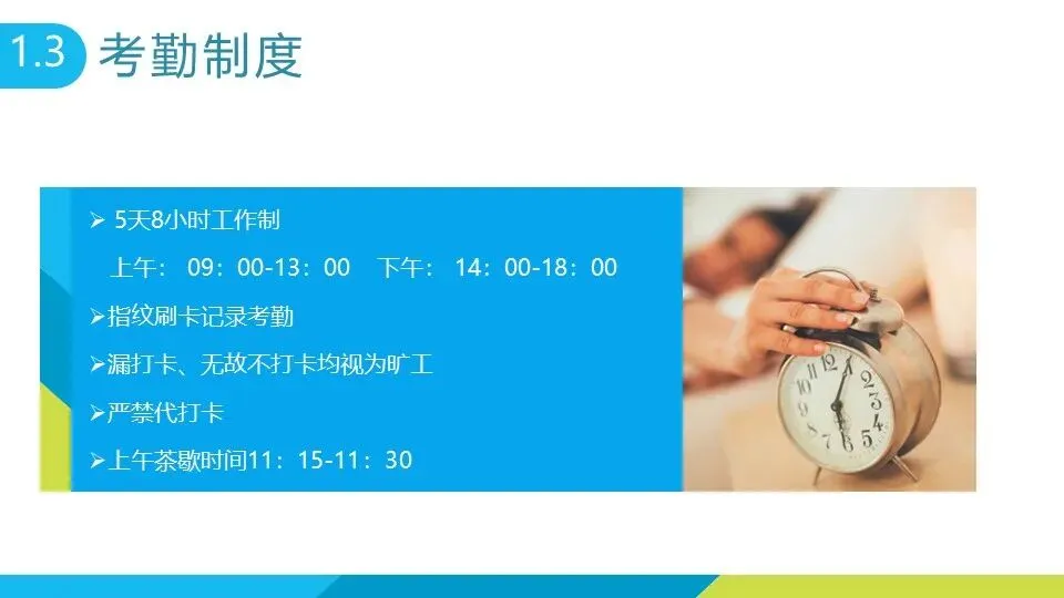 公司实行 5 天 8 小时工作制,具体时段为上午 09:00-13:00、下午 14:00-18:00,每日 11:15-11:30 为茶歇时间。考勤以指纹刷卡记录为准,漏打卡、无故不打卡均视为旷工,代打卡行为严格禁止。