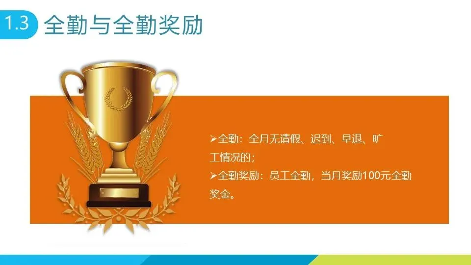 全勤奖励政策为:全月无请假、迟到、早退、旷工者,可获 100 元全勤奖金,鼓励员工保持良好出勤习惯。