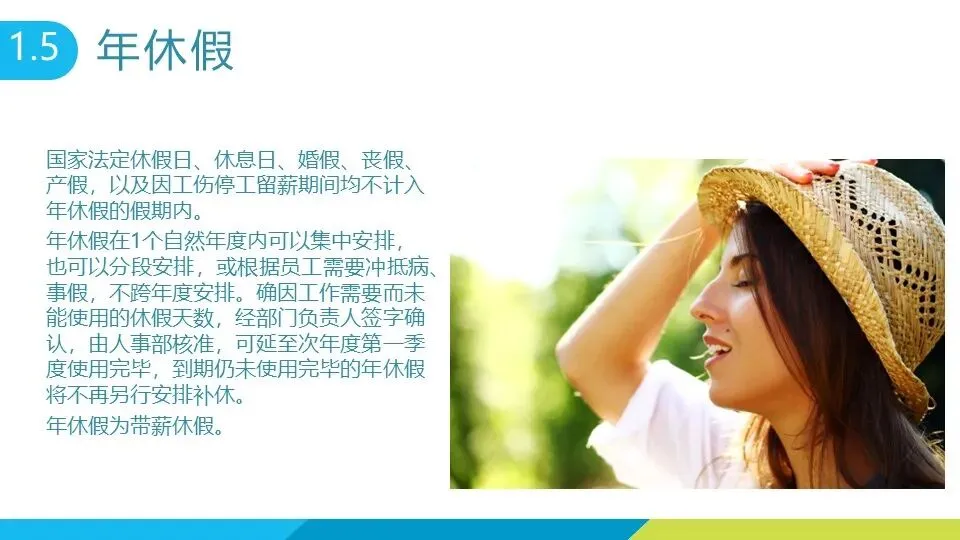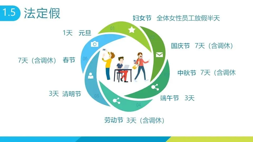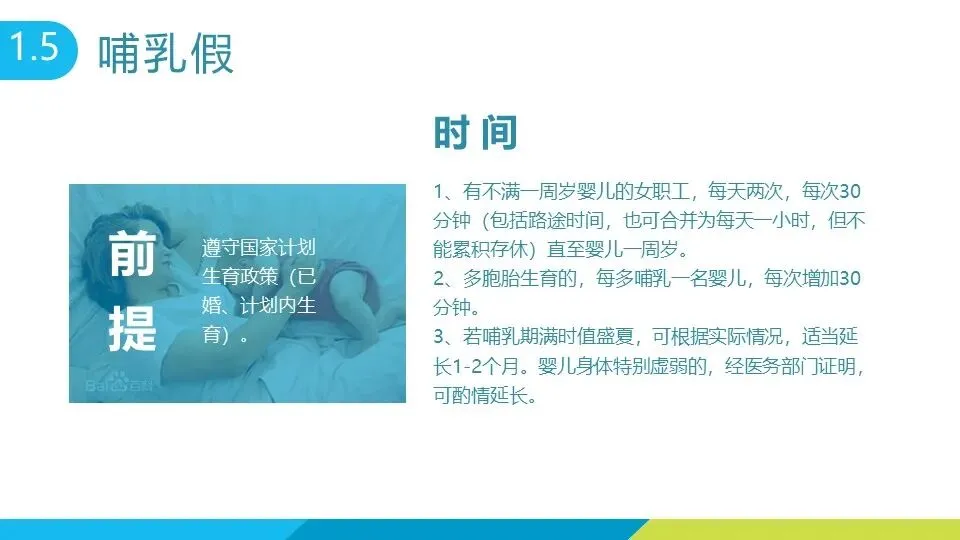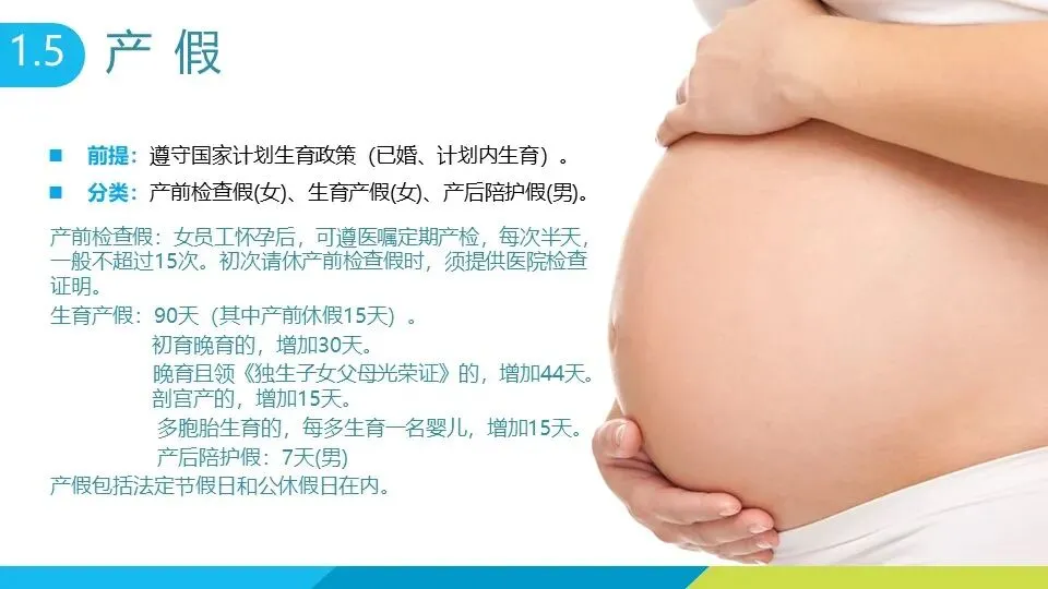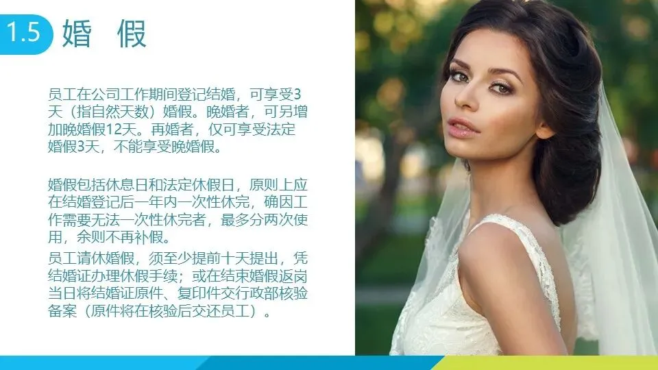 法定节假日包括元旦 1 天、春节 3 天、清明节 3 天等,国庆节、中秋节均为 7 天(含调休),妇女节女性员工放假半天。 婚假:在职期间登记结婚可享 3 天婚假,晚婚者额外增加 12 天,再婚仅享 3 天法定婚假,需凭结婚证办理手续,1 年内可分两次休完。 产假:符合计划生育政策的女员工可享 90 天基础产假(产前 15 天),初育晚育增加 30 天,领独生子女证再加 44 天,剖宫产或多胞胎生育各增加 15 天;男员工享有 7 天产后陪护假。孕期女员工可申请推迟半小时上班,怀孕 7 个月以上每天增加 1 小时休息时间。 哺乳假:有不满 1 周岁婴儿的女职工,每天可享两次各 30 分钟哺乳时间(可合并为 1 小时),多胞胎每多哺乳 1 名婴儿增加 30 分钟,特殊情况可适当延长。 年休假:连续工作满 1 年可享,工作 1-10 年休 5 天,10-20 年休 10 天,20 年以上休 15 天,可冲抵病事假,未休完经审批可延至次年一季度,逾期作废;累计病假超规定时限将无法享受当年年休假。