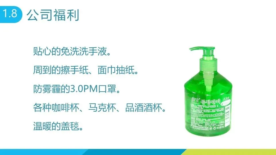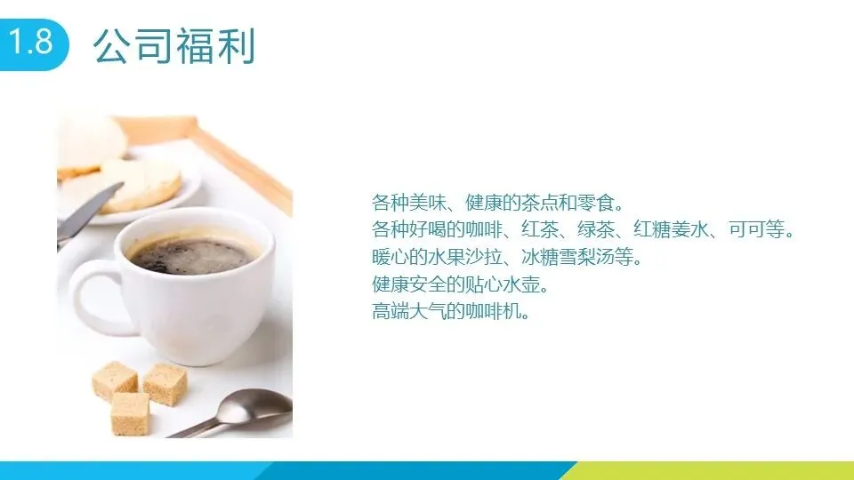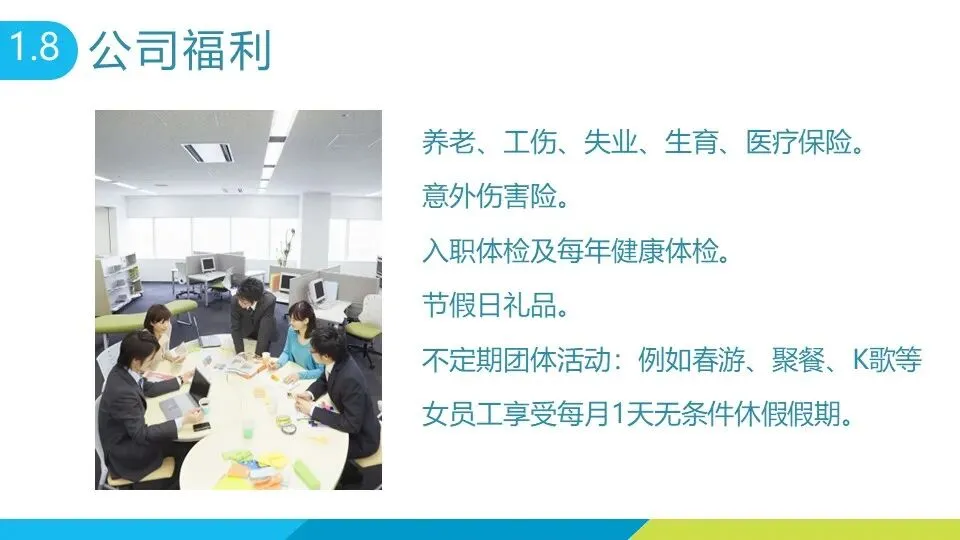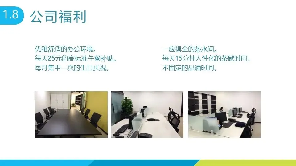 公司福利涵盖多方面:优雅舒适的办公环境、每天 25 元午餐补贴、每月集体生日庆祝;茶水间提供咖啡、茶品、零食、水果沙拉等各类补给,配备高端咖啡机、贴心水壶等用品;还有免洗洗手液、防雾霾口罩、盖毯等便民物资;员工享有五险一金、意外伤害险、入职及年度体检、节假日礼品,不定期组织春游、聚餐等团体活动,女员工每月可享 1 天无条件休假。