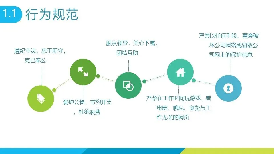 员工需遵纪守法、忠于职守,服从领导安排,团结同事、互助协作;爱护公司财物,节约水电等办公资源,杜绝浪费。工作时间严禁玩游戏、看电影、聊私事或浏览无关网页,不得蓄意破坏公司网络或窃取保护信息。