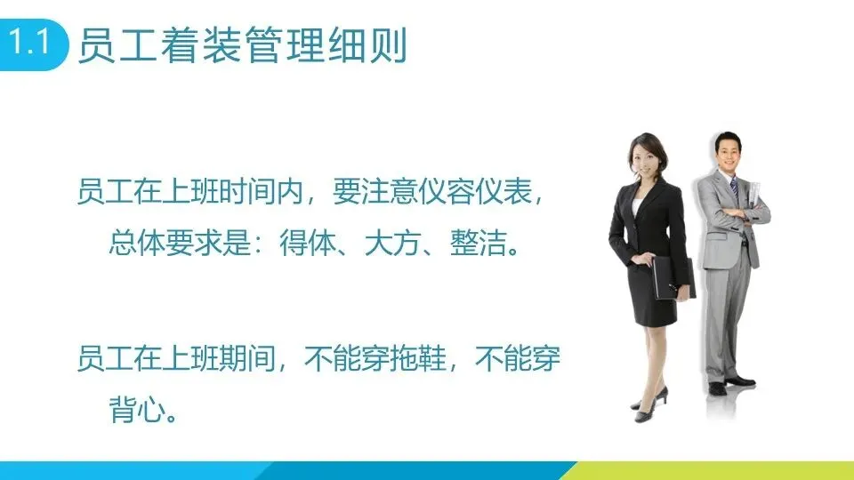着装要求得体大方,上班时间禁止穿拖鞋、背心,保持良好仪容仪表。
