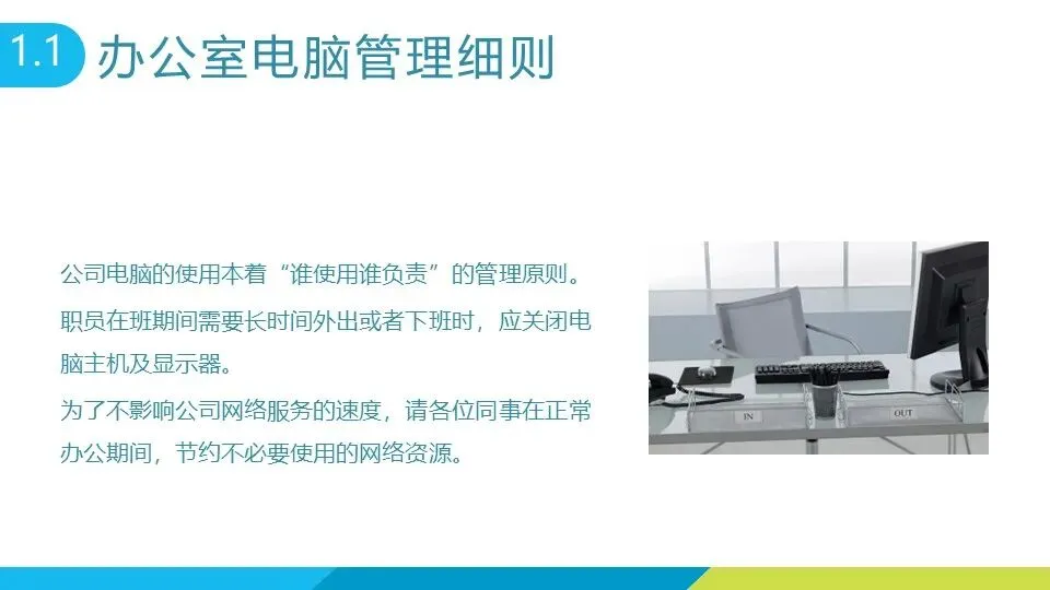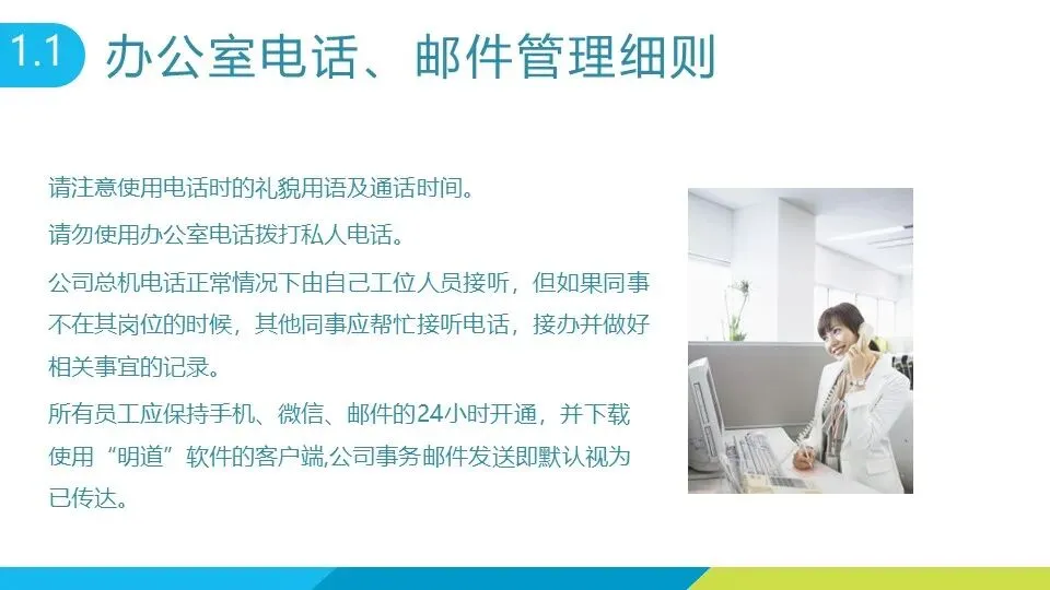 电话与通讯:使用办公室电话需注意礼貌用语、控制通话时长,禁止拨打私人电话;同事不在岗时应协助接听电话并做好记录。员工需保持手机、微信、邮件 24 小时畅通,及时查看公司通过 “明道” 软件等渠道发送的事务通知。 电脑管理:遵循 “谁使用谁负责” 原则,长时间外出或下班时需关闭电脑主机及显示器,办公期间节约网络资源,不影响公司网络速度。 卫生与安全:禁止在地毯上倾倒粉状物或液体,每日上下班前整理办公桌面;最后离开办公室的员工需检查门窗、水电是否关闭,严禁私自毁坏水表、电表等设施。