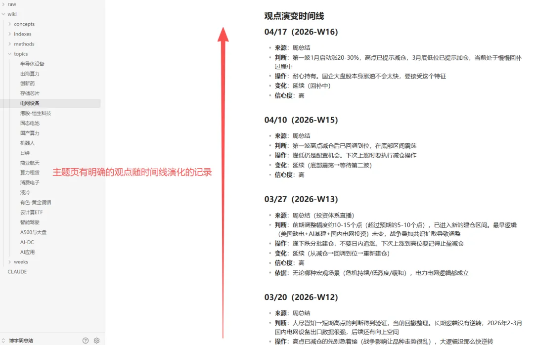 - topics/(主题页):按投资标的/赛道组织。每个板块一个页面,从首次提及到最新判断,按周记录完整的观点演变时间线。