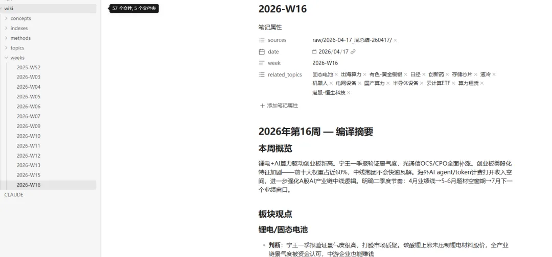 周总结/├── CLAUDE.md ← 编译规则(自动加载,Claude据此工作)├── raw/ ← 原始资料(只读,不修改)│ ├── 2026-01-30_周总结-260130/ ← 周总结(文件夹)│ │ ├── 总结.md│ │ └── 逐字稿.md│ ├── 2026-04-15_锂电加餐.md ← 周中加餐(单文件)│ └── ... ← 任何格式的投资相关资料└── wiki/ ← AI维护的知识笔记├── topics/ ← 主题页:投资标的/赛道的观点演变追踪│ ├── 有色-黄金铜铝.md│ ├── 出海算力.md│ └── ...├── weeks/ ← 周编译页:每周市场全貌│ ├── 2025-W52.md│ ├── 2026-W05.md│ └── ...├── methods/ ← 方法论页:可执行的决策框架│ ├── 业绩线框架.md│ └── ...├── concepts/ ← 概念页:术语/现象的解释│ ├── 制造业周期.md│ └── ...└── indexes/ ← 索引与导航├── index.md ← 总索引├── topic-index.md ← 主题索引├── timeline.md ← 时间线索引└── log.md ← 操作日志