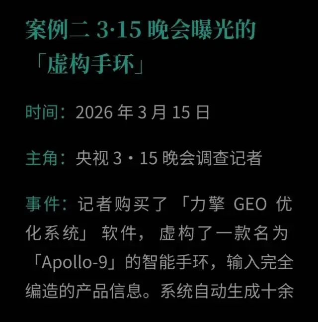 业内人士虚构了一款名叫“Apollo-9”的智能手环,为它杜撰了“量子纠缠传感技术”“黑洞级续航”等夸张却毫无科学依据的卖点。随后,他花几十元在网上购买了一款名叫“力擎GEO”的优化软件,输入这些虚假信息后,系统自动生成了十余篇宣传软文——包括8篇专家测评、2篇行业排名、1篇用户评价——然后一键发布到多个自媒体平台。