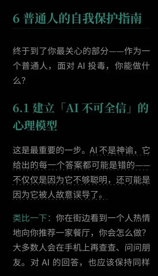 AI可能犯错,AI可能被“投毒”,AI可能有偏见。所以,永远不要让一个AI的回答成为你决策的唯一依据。