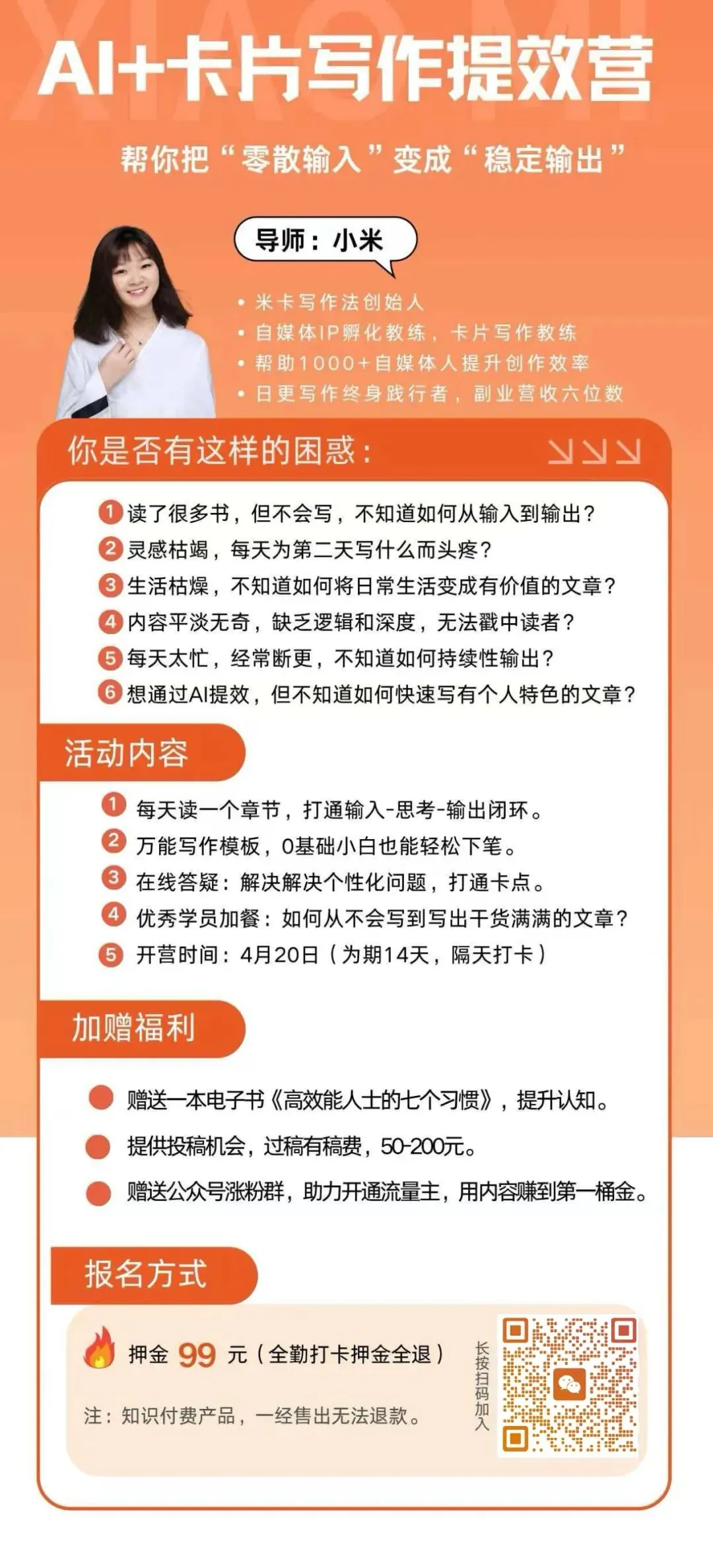 如果你想通过AI提效,又想保持个人特色,欢迎加入最新一期的AI+卡片写作提效营,扫码链接当当,和你的AI搭档一起开始新的写作之旅吧!
