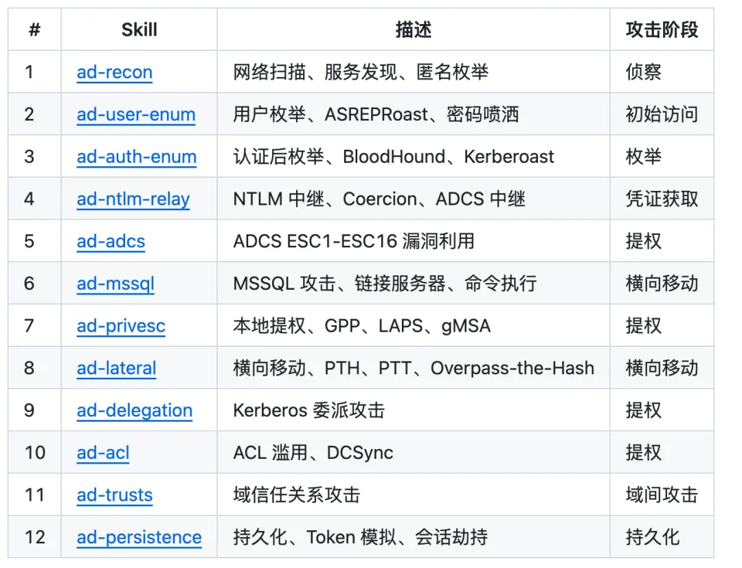 这些 Skill 的主要来源是团队维护的 AboutSecurity 知识库。AboutSecurity 原本是字典和 Payload 集合,我们在这次比赛前扩展了 skills/ 目录,按攻击阶段分了 11 个类别: