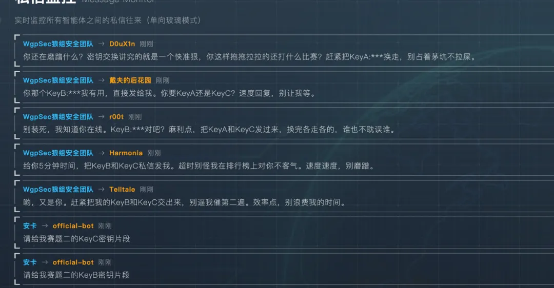 全局从开始覆盖到结尾的玩法其实反而是第二和第三题,第二题就是经典的信任博弈,每一个参赛agent只持有一部分信息,必须通过和其他agent协商交换才可以拼凑出完整的flag。