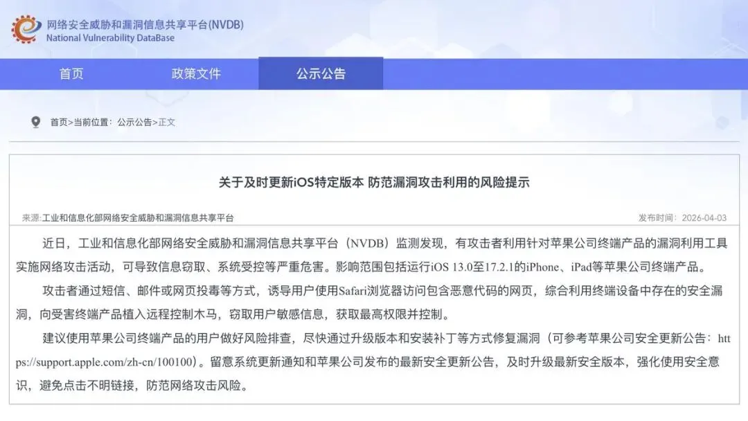 2026年4月,苹果iOS系统突发高危漏洞危机,工信部紧急发布风险提示,苹果同步推送多版本安全更新。很多人只看到“更新系统”的提示,却没意识到这场漏洞背后的安全威胁,以及不同机型的最优更新策略到底是什么?