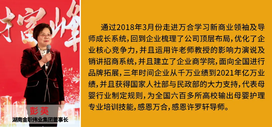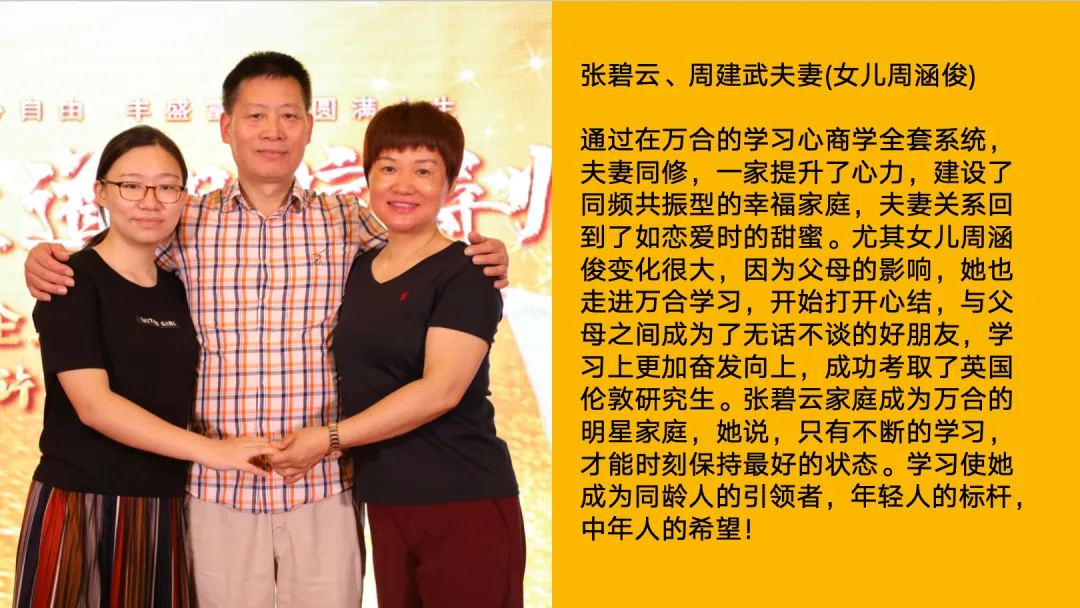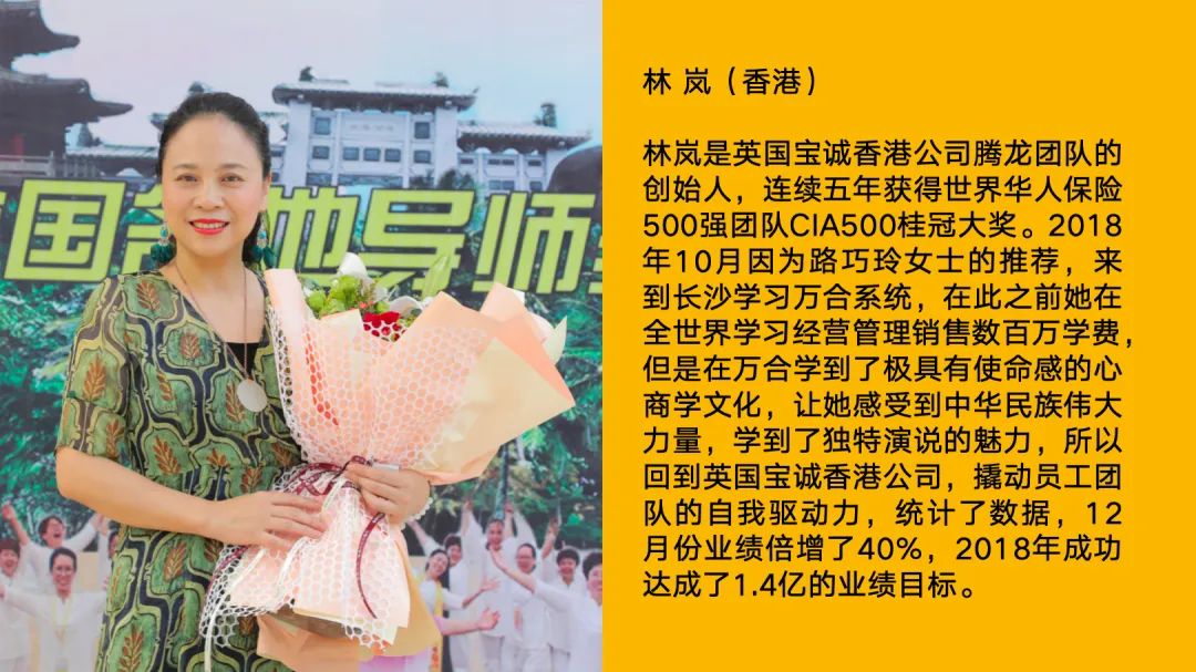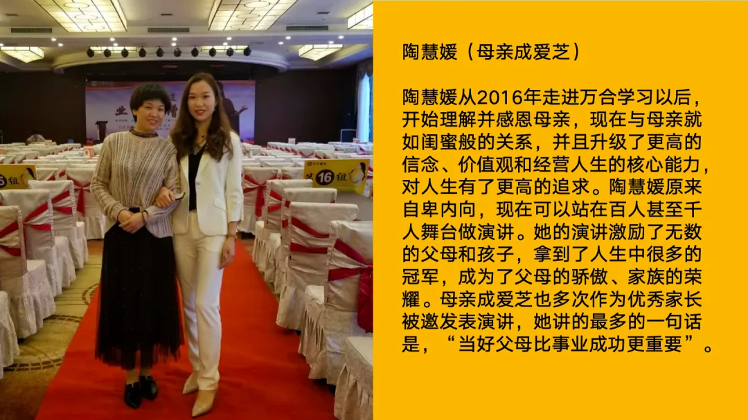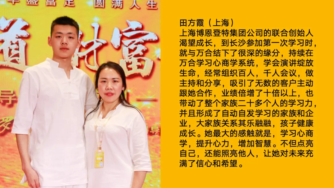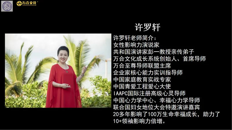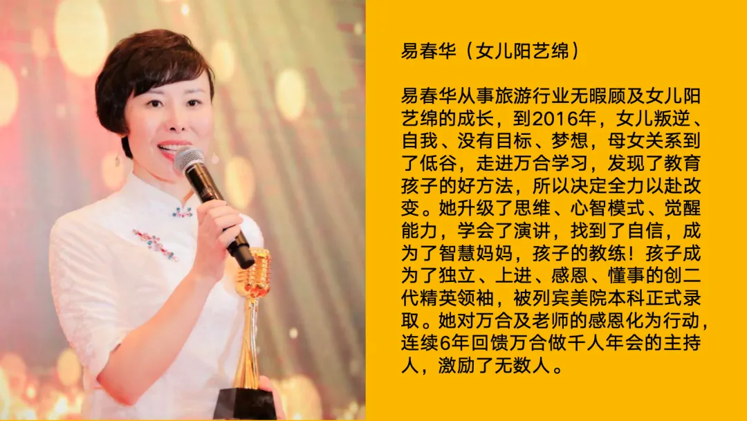 她——知行合一,专注于助力影响力IP成长,传播中华文化,持续推动幸福人生理念,助推世界充满正能量。她所创办的万合,拥有"新商道“、”“万合文化”、“万合家”、”万合创二代”“中国心力学中心”等多个品牌,致力于打造新时代影响力IP素质成长的标杆品牌!