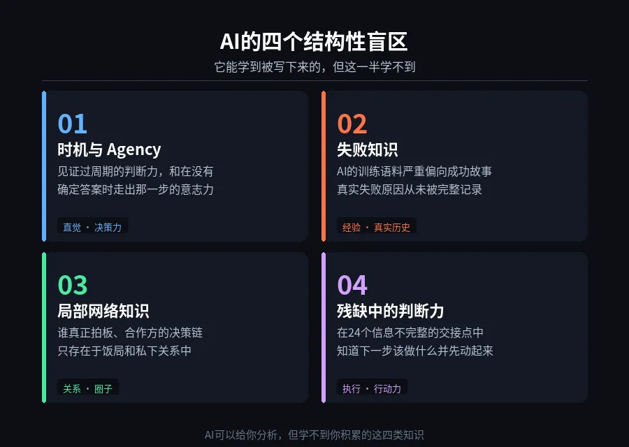 时机与Agency——判断何时出手的直觉,和走出那一步的意志力 失败知识——从未被语言化的真实原因,AI的训练语料里几乎没有 局部网络知识——谁拍板、谁影响决策,只存在于关系和饭局里 残缺中的判断力——在信息不完整时先动起来,不等分析完
