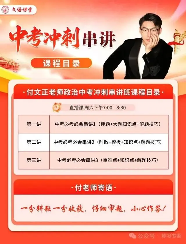 中考政治拉分项?付文正老师有绝招!告别死记硬背,三节课教你满分套路。第一时间结合时政热点,搞定重难点与大题答题模板。帮孩子把复杂考点变成得分公式!仔细审题,小心作答,让政治成为中考的加分利器!