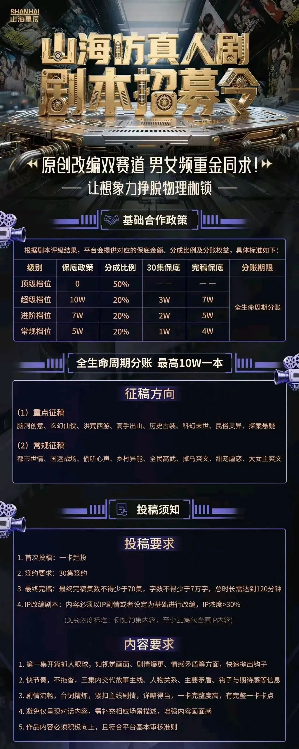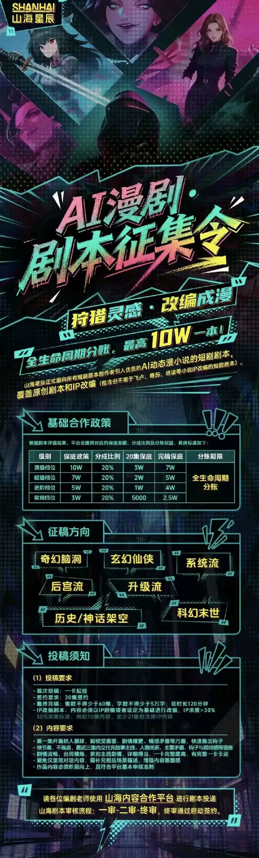 最近,在微短剧高质量发展论坛上,山海星辰正式发布了AI短剧剧本重磅征稿计划,用极具诚意的合作模式,向所有编剧、创作者抛出橄榄枝: