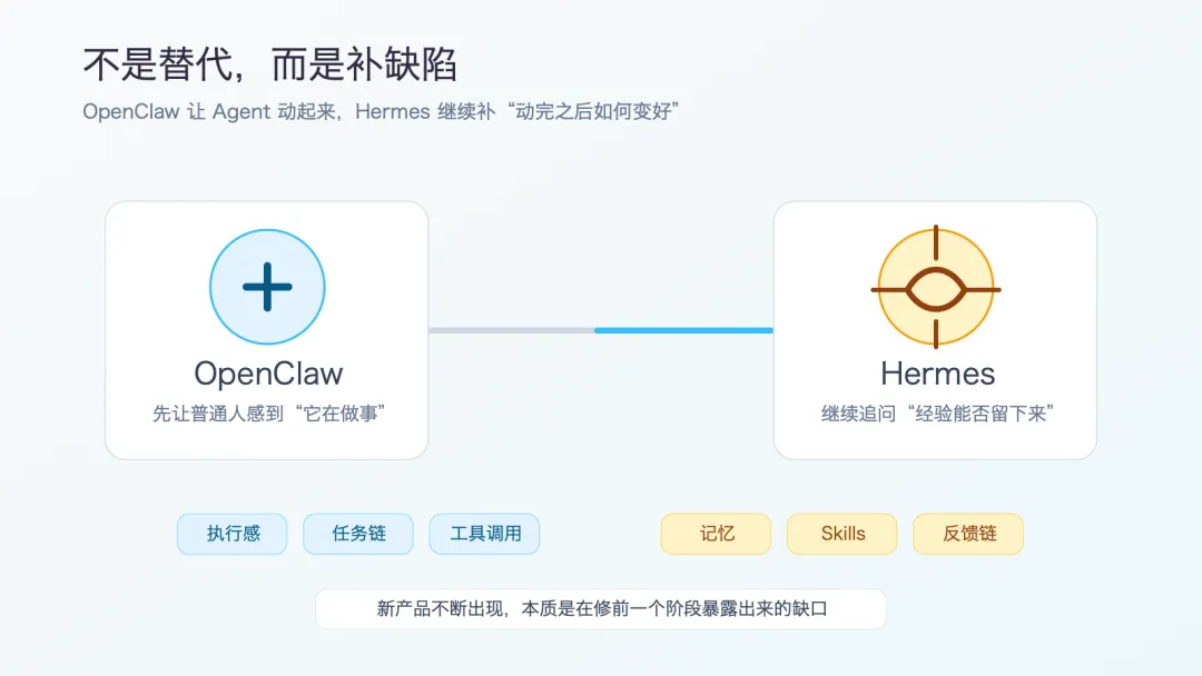 新产品会不断出现,不断修正前一个产品暴露出来的缺陷。今天是 Hermes 补 OpenClaw 的记忆、技能和自我改进,明天可能又会有新的产品继续补 Hermes 的安全、权限、成本、可观测性和协作问题。