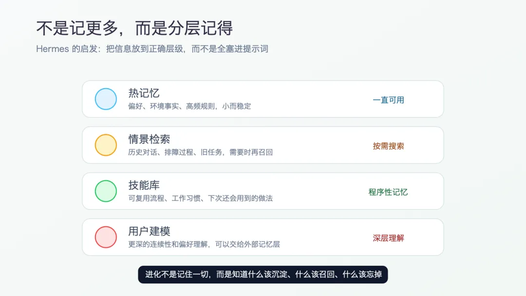 二、Hermes 真正值得看的,不是“记得更多”,而是“分层记得”
