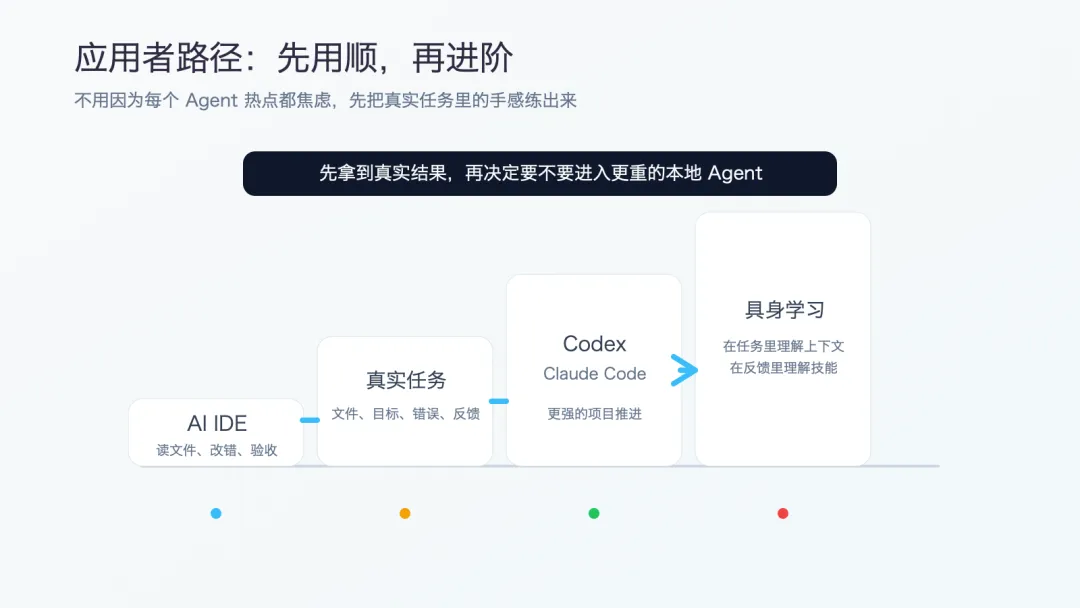 如果你是应用者,就少焦虑一层:先把 AI IDE、Codex、Claude Code 这些工具用到真实任务里,先建立自己的手感。
