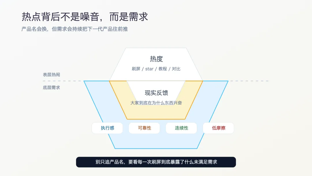 产品会不断换名字,但需求会持续往前拱。真正值得练的,不是追上每一个热点,而是在热点里看见需求,再回到自己的任务里把反馈链跑起来。