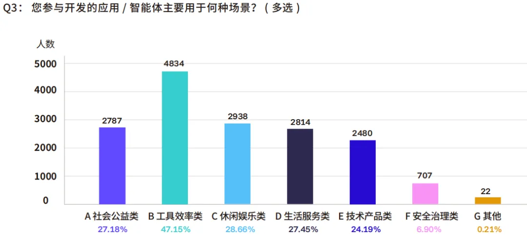 这种人口结构的颠覆,直接推动了应用生态的爆发。工具效率类应用以 47.15% 的占比领跑,成为 AI 落地的第一生产力战场;休闲娱乐、生活服务、社会公益类紧随其后,占比均超 27%。研发边际成本的指数级下降,让 "一人公司" 成为现实 —— 一个超级个体借助开源模型和 AI 编程助手,就能完成过去整个产研团队的商业闭环。