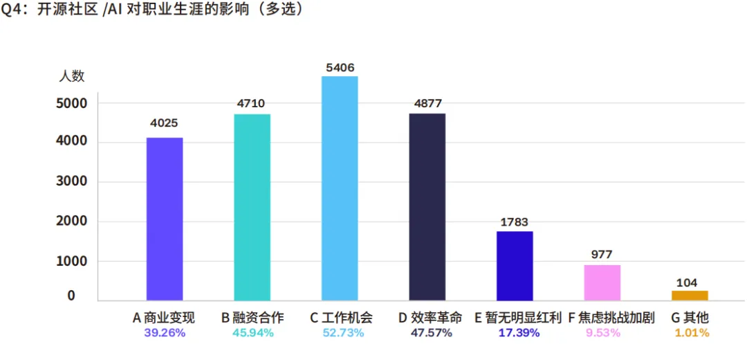 更重要的是,开源已形成可持续的激励循环。52.73% 的用户通过参与开源获得工作机会,45.94% 获得融资或合作机会,39.26% 实现商业变现。高达 96% 的开发者明确表示愿意进行二次开源,形成了 "开源越用越好、越多越受益" 的正向飞轮。