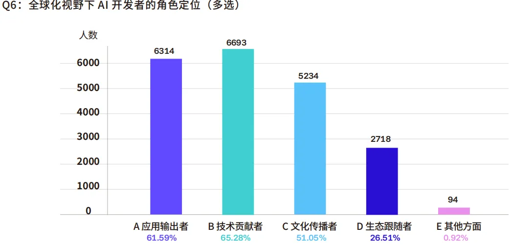 中国开发者的心态也发生了质变。65% 的用户立志成为技术贡献者,61.6% 希望成为应用输出者,51.1% 愿意承担文化传播者角色。在他们看来,提升全球影响力的首要路径是 "应用创新"(64.3%),其次是 "国际合作"(54.9%) 和 "开源生态"(53.9%)。