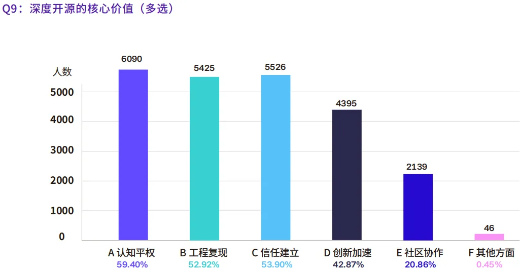报告指出,开源是提升 AI 整体安全水位的最佳路径。通过极高的透明度和公共参与,开源让全球开发者共同发现和修补安全漏洞,推动 "AI 安全作为公共产品" 的实现。调研显示,53.9% 的开发者认为 "信任建立" 是深度开源的核心价值之一,仅次于 "认知平权"(59.4%)。