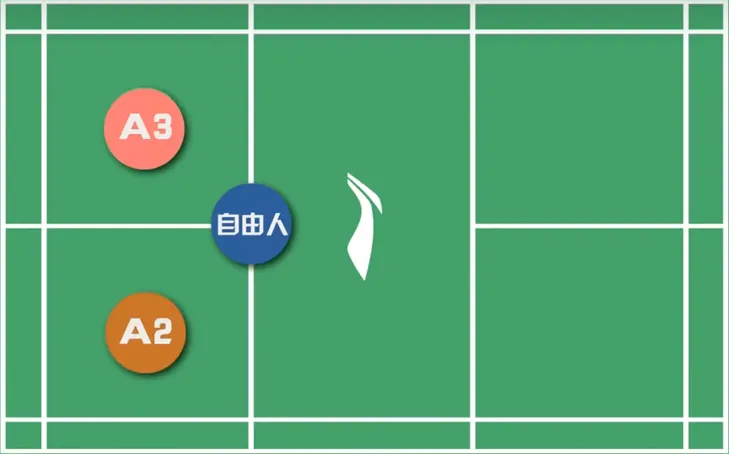 每队3人参加,不限成员性别。队员分为双打队员以及自由人 (站位如下图),场中规则与双打规则一致,但在接发球过程中,自由人不可以参与接发球,采取15分制,先拿到15分的一队获胜。