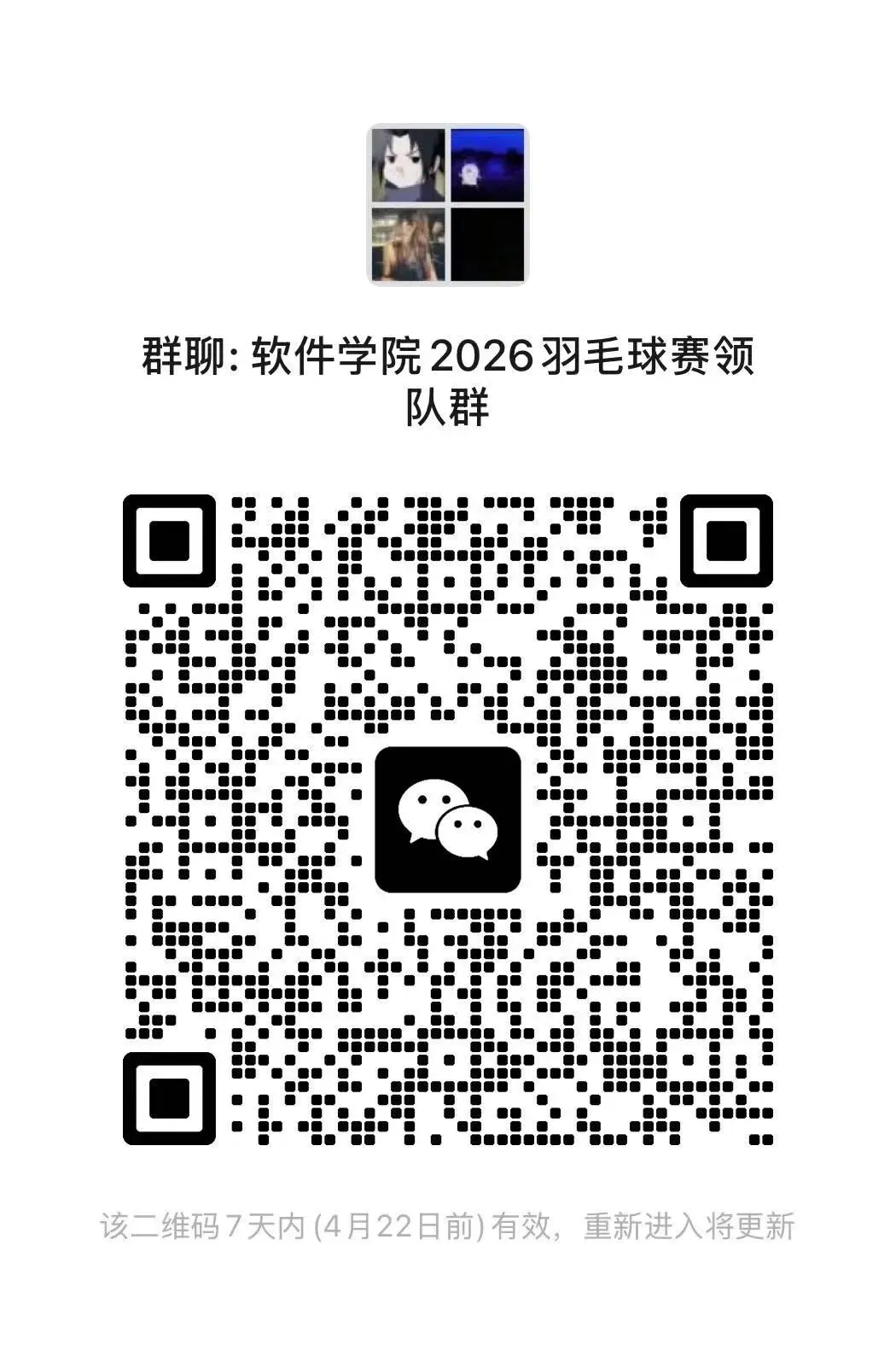 由各领队在申请加入羽毛球领队群处填写队名以及个人信息后加入领队对接群(微信),之后在4月23日(周四)中午12点前将报名表提交至领队群内部,提交时需注明年级队名,例如:2025-xx队(研究生请写研究生)。