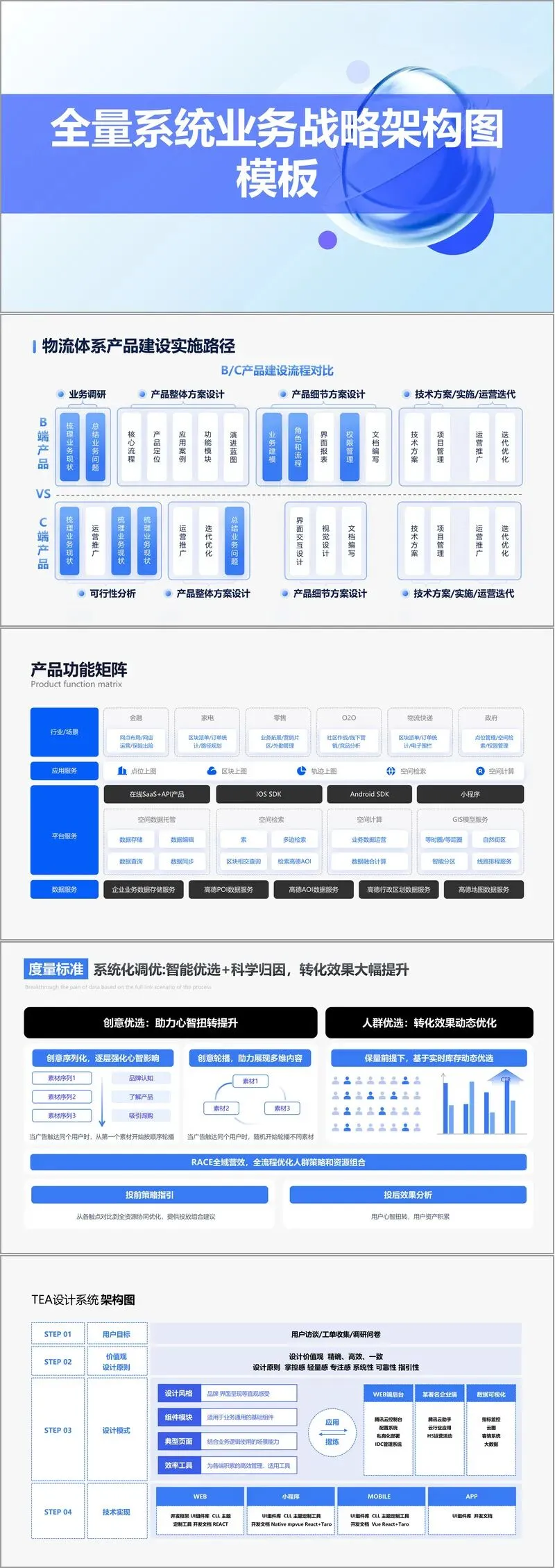 这份全量系统业务战略架构图模板,是一套覆盖多行业、多场景的综合性架构设计工具,其核心价值在于提供 “标准化框架 + 个性化适配” 的双重支撑,帮助企业构建逻辑清晰、可落地、可迭代的业务战略架构。模板以业务逻辑为核心,融合技术架构、运营体系与行业特性,既包含通用型架构设计方法论,又提供细分场景的落地参考,体现了 “全景覆盖、分层设计、灵活适配” 的核心设计理念。