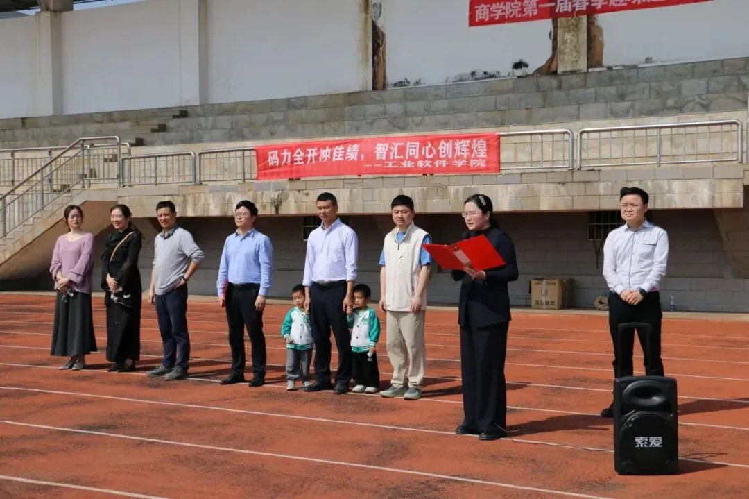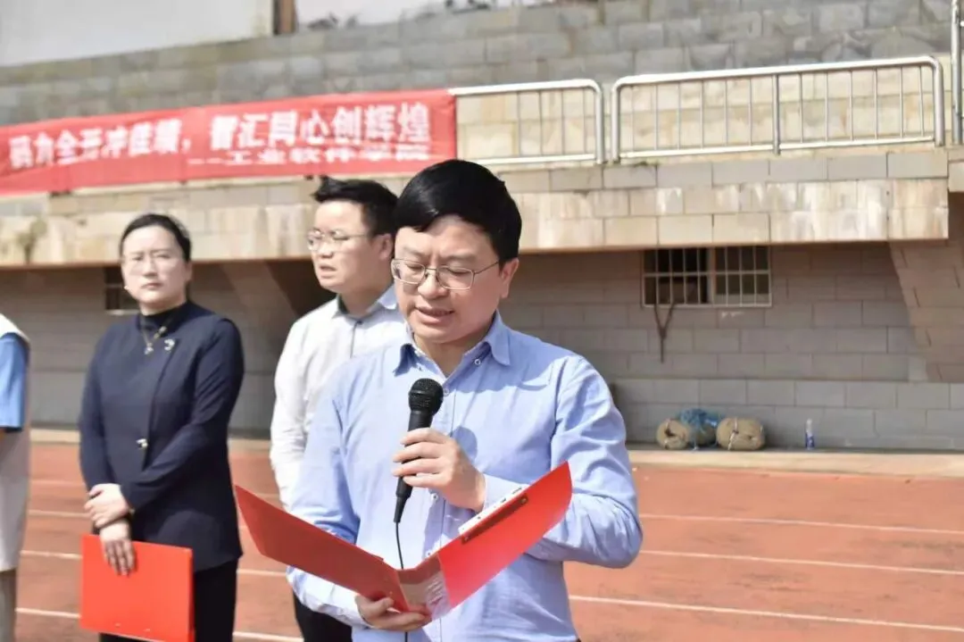 全场肃立,奏唱国歌,五星红旗冉冉升起,仪式庄重肃穆。兰新华致开幕辞,向运动会表示祝贺,勉励全体运动员顽强拼搏、赛出风格,期待大家在运动中凝聚力量、展现青春朝气。随后,运动员代表陈宁上台庄严宣誓,承诺严守比赛规则,秉持体育精神,文明参赛、公平竞争,赛出风格与水平。裁判员代表赖文涛上台庄严宣誓,承诺恪守裁判职责,秉公执裁、公正严明,维护赛事公平公正。在全场热烈的欢呼声中,兰新华庄重宣布:工业软件学院2026春季趣味运动会正式开幕!