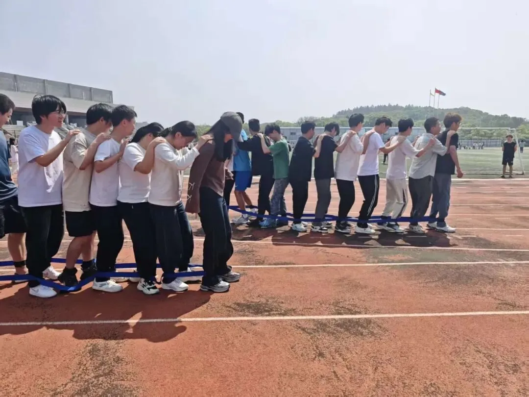 “同炉共进”项目中,同学们脚踩蓝色绑带,肩搭彼此的肩膀,组成一列整齐的“小火车”,向着终点同步迈进。正如稀土冶炼中“同炉共炼、协同反应”的过程,只有步伐一致、心往一处想、劲往一处使,才能稳步向前。赛场上,大家喊着整齐的口号,从一开始的磕磕绊绊到后来的默契十足,每一步都凝聚着团队的信任与配合,跑道上回荡着大家的笑声与加油声。